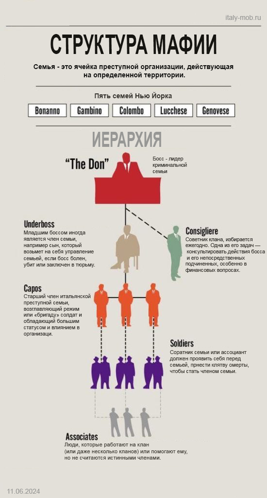 В 1984 году осведомитель мафиози Томмазо Бушетта объяснил прокурорам командную структуру семьи мафии. Клан возглавляет «босс»(The don, capofamiglia или rappresentante), которому помогает младший босс (Underboss, capo bastone или sotto capo) и c которым работают один или несколько советников (consigliere). Под их началом находятся группы (децина), численностью около десяти «солдат» (Soldiers). Каждую децину возглавляет каподецина(Capo, Caporegime).